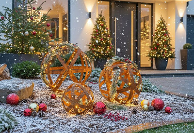 I materiali resistenti agli agenti atmosferici come il metallo sono particolarmente adatti per l'uso esterno e soprattutto per il giardino. Puoi anche creare un'atmosfera festosa in giardino con rami, lucine e palline.
