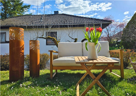 La finitura ruggine è particolarmente apprezzata nei giardini naturali e in combinazione con materiali naturali come legno e pietra. Con il tempo, sviluppa una patina unica che conferisce a ogni colonna portante da esterno il suo fascino unico. La finitura verniciata a polvere grigio opaco, a sua volta, crea un look moderno ed è particolarmente adatta a progetti di giardino minimalisti o architettonicamente puliti. Entrambe le versioni offrono una protezione affidabile dagli agenti atmosferici e colpiscono per la loro durata e la lavorazione di alta qualità.