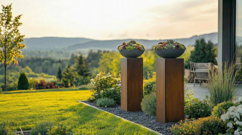 Con una base quadrata di 33 x 33 cm e un peso di 11,4 kg, la colonna in metallo effetto ruggine colpisce per la sua stabilità e il suo design pulito. È la superficie distintiva a conferire alla colonna il suo fascino inconfondibile: la colonna in metallo con effetto ruggine si inserisce armoniosamente negli ambienti naturali dei giardini, diventando – con discrezione – un elegante elemento di attrazione. Sia come pezzo singolo che in combinazione con altri elementi: la colonna in metallo è ideale come elemento decorativo di alta qualità e conferisce struttura e profondità al design del vostro giardino.
