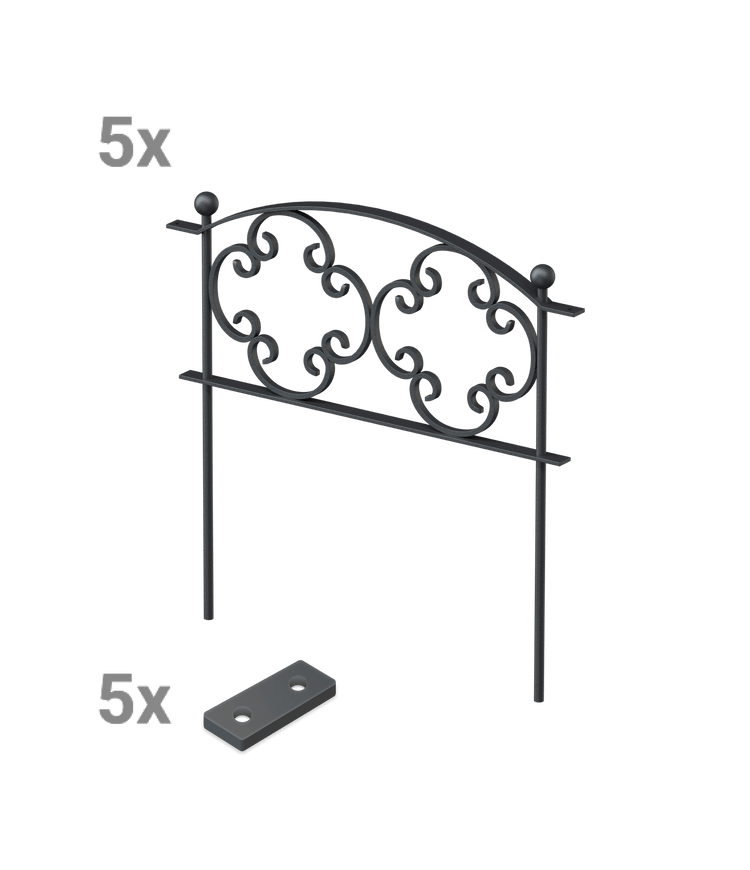 La nostra romantica recinzione per aiuole "Rosa" con il suo design floreale è disponibile qui come pratico set completo. Il set comprende cinque elementi di recinzione, ciascuno largo 49,8 cm e alto 47,3 cm. Gli elementi di recinzione vengono semplicemente inseriti nel terreno e collegati tra loro tramite piastre metalliche e viti. La finitura può essere scelta liberamente.